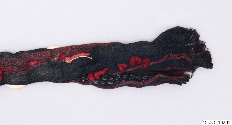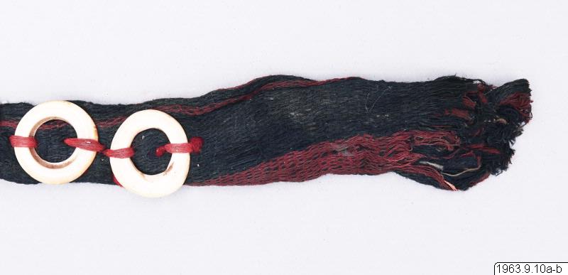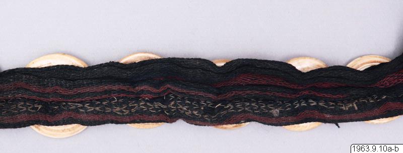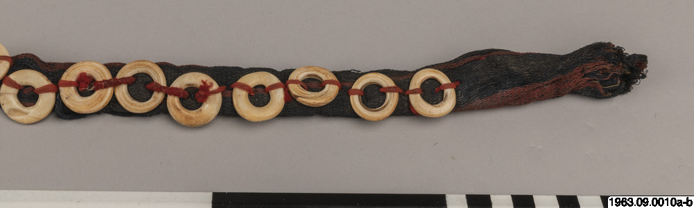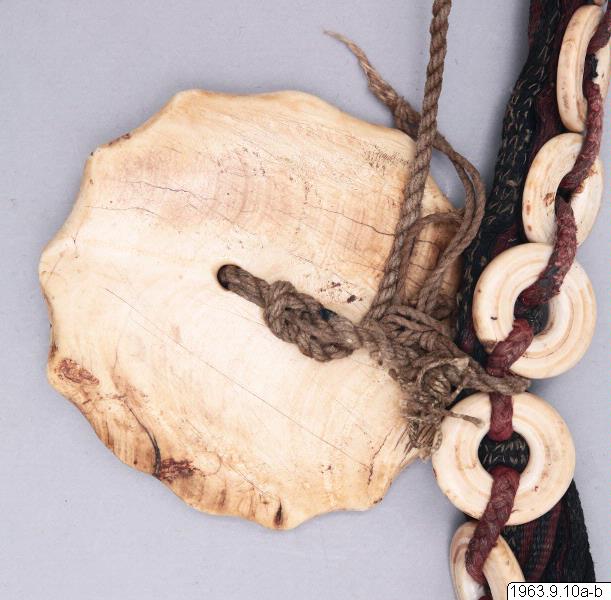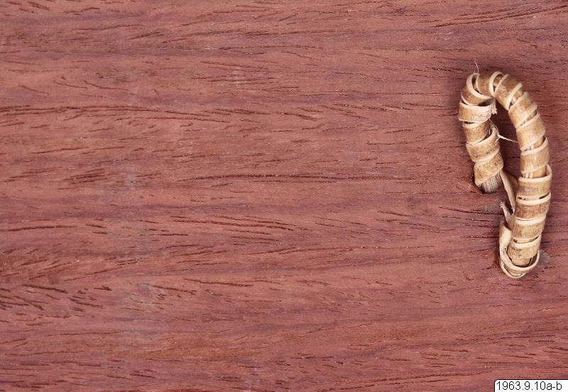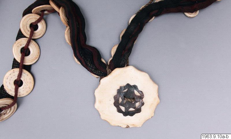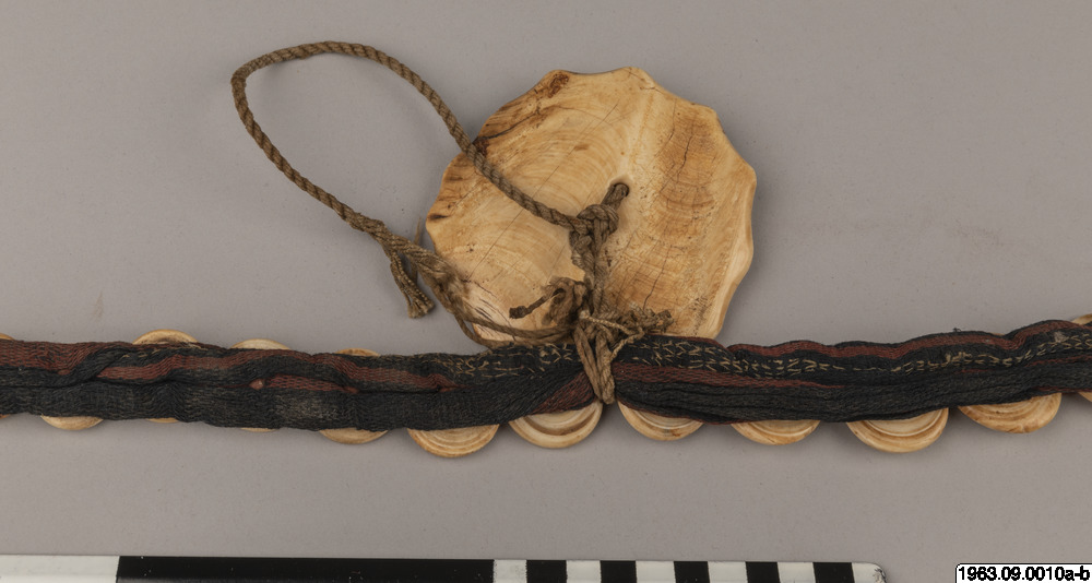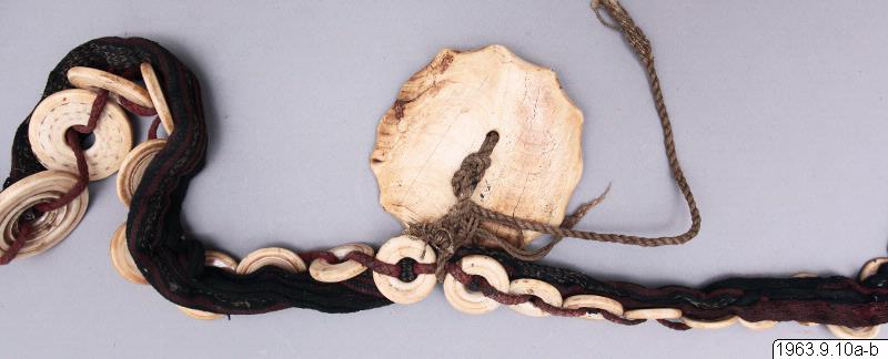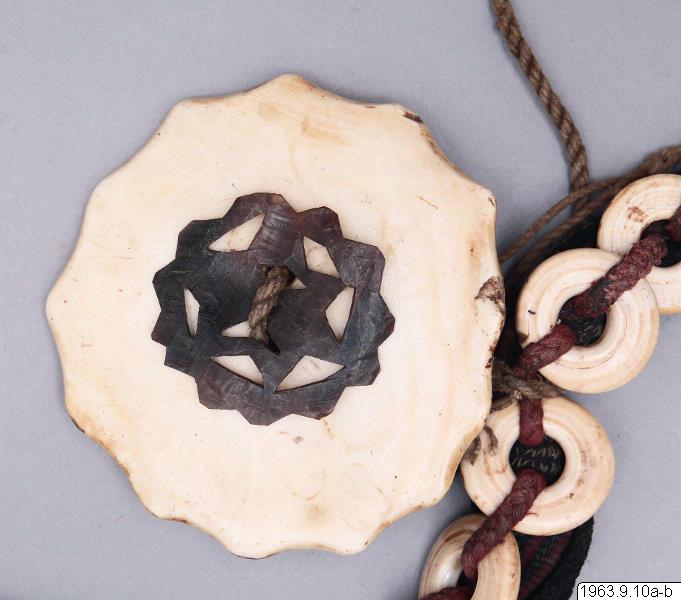 Klingans ena sida ligger bar. Baljans längd: 40 cm, Gehäng prytt med snäckskalsringar och en stor snäckskalsskiva. Denna i sin tur prydd med en genomskuren sköldpaddasskiva i kapkapteknik. Denna med balja och gehäng, kallas ginuttu. Bolo.