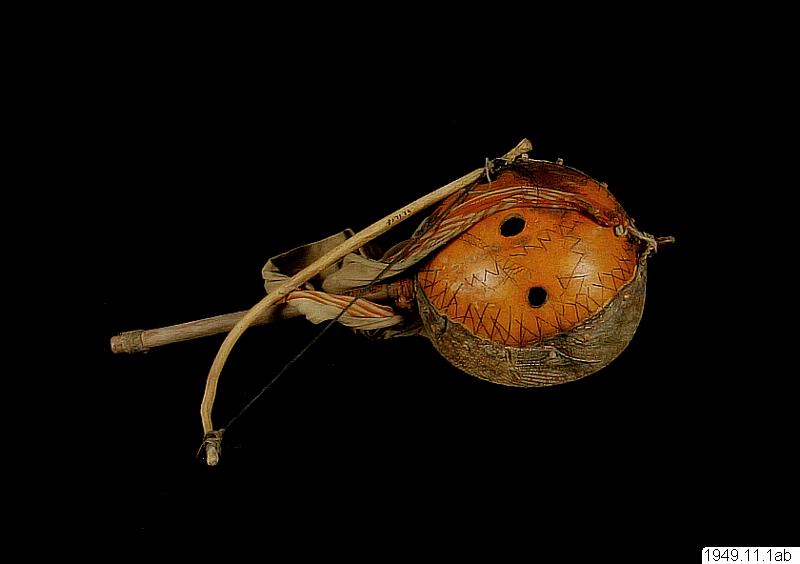 One-stringed violine with bow, "Riti". Made by Djibu, Sow, Sidjasen. Ha has learnt the art from his father. The family originate from the area around St. Louis and belongs to the cattle owning Pheul-tribe.