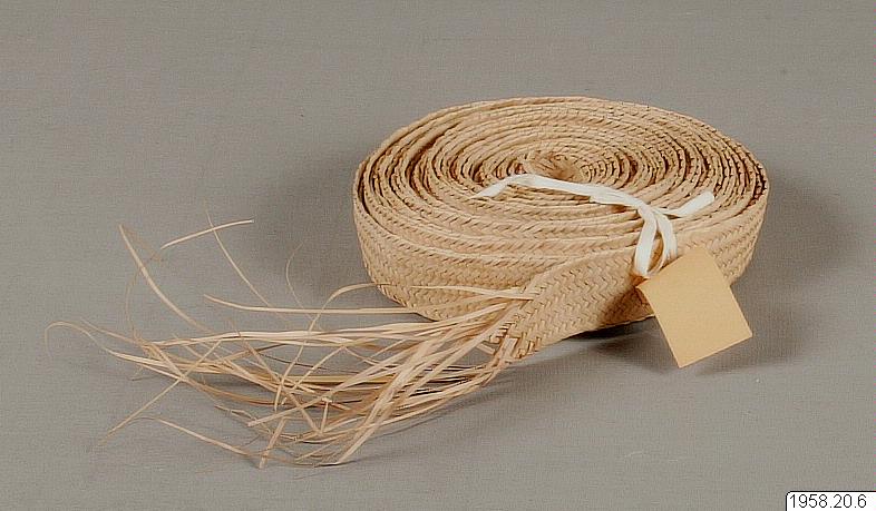 Band flätat i kypertteknik. Fiskbensmönster. Bredd 3 cm. Band av detta slags sys ihop till sovmattor och väskor.