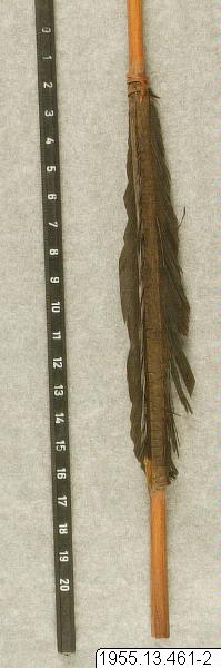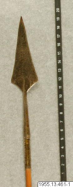 Pil med bladformig spets av järn. Holk. Mässingsbleck lindat om skaftet nedanför holken. Radial befjädring. Djup skåra. Längd: 83 cm.